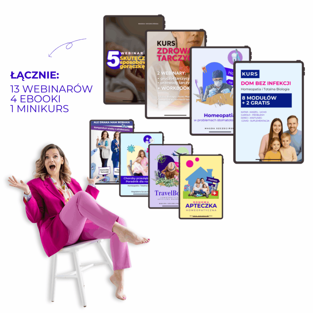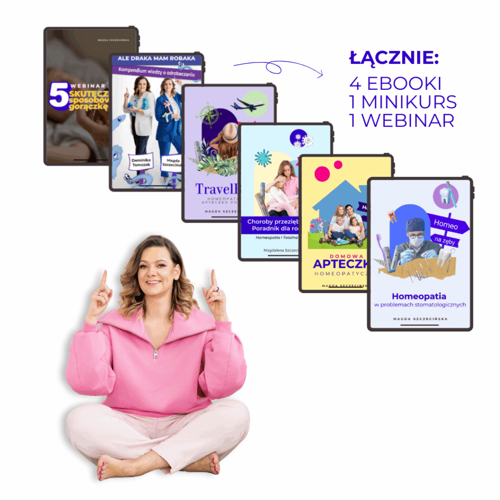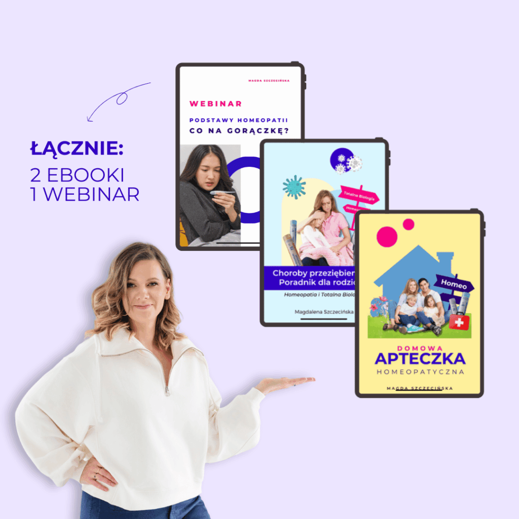 - 📚 Wszystkie 4 Ebooki: Choroby przeziębieniowe, Travelbook, Domowa Apteczka Homeopatyczna, Ale draka mam robaka.